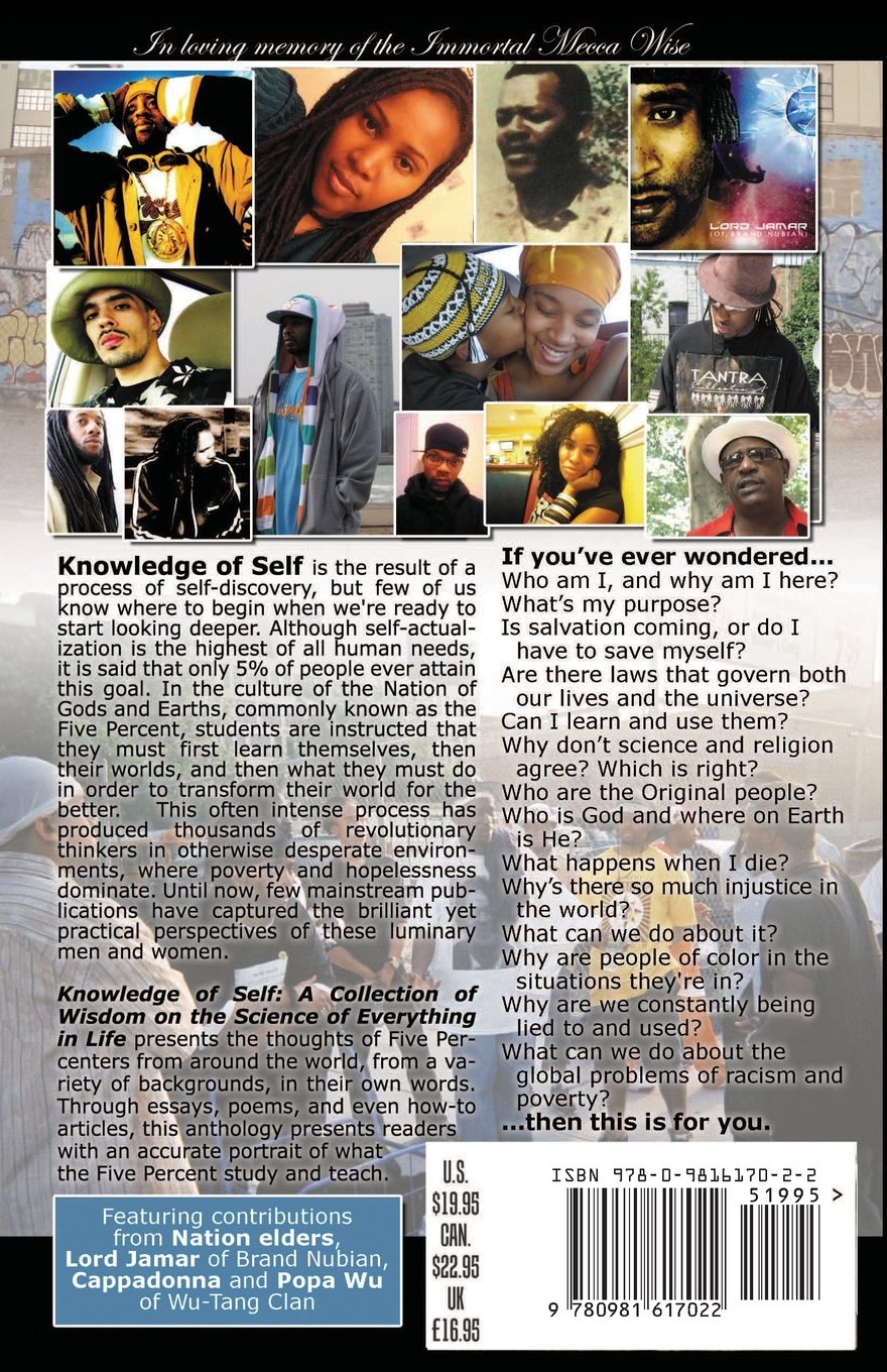 Do you know who – and what – you are? Do you know who you’re meant to be? Do you know how to find the answers to questions like these? Knowledge of Self is the result of a process of self-discovery, but few of us know where to begin when we’re ready to start looking deeper. Although self-actualization is the highest of all human needs, it is said that only 5% of people ever attain this goal. In the culture of the Nation of Gods and Earths, commonly known as the Five Percent, students are instructed that they must first learn themselves, then their worlds, and then what they must do in order to transform their world for the better. This often intense process has produced thousands of revolutionary thinkers in otherwise desperate environments, where poverty and hopelessness dominate. Until now, few mainstream publications have captured the brilliant yet practical perspectives of these luminary men and women. Knowledge of Self: A Collection of Writings on the Science of Everything in Life presents the thoughts of Five Percenters, both young and old, male and female, from all over the globe, in their own words. Through essays, poems, and even how-to articles, this anthology presents readers with an accurate portrait of what the Five Percent study and teach, as well as sound direction on how to answer timeless questions like: Who am I, and why am I here? Why is there so much injustice in the world, and what can be done about it? Who is God and where on Earth is he? How do I improve myself without losing myself? Why are people of color in the situations they’re in? What can we do about the global problems of racism and poverty?